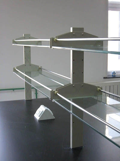 5、試劑架防落架:采用1.0mm優(yōu)質(zhì)鋁合金橢圓型材,經(jīng)酸洗磷化處理后噴涂環(huán)氧樹脂粉末高溫烘烤固化而成,形成通體防落架,有效防止試劑跌落,保護(hù)實(shí)驗(yàn)室工作人員人身安全。